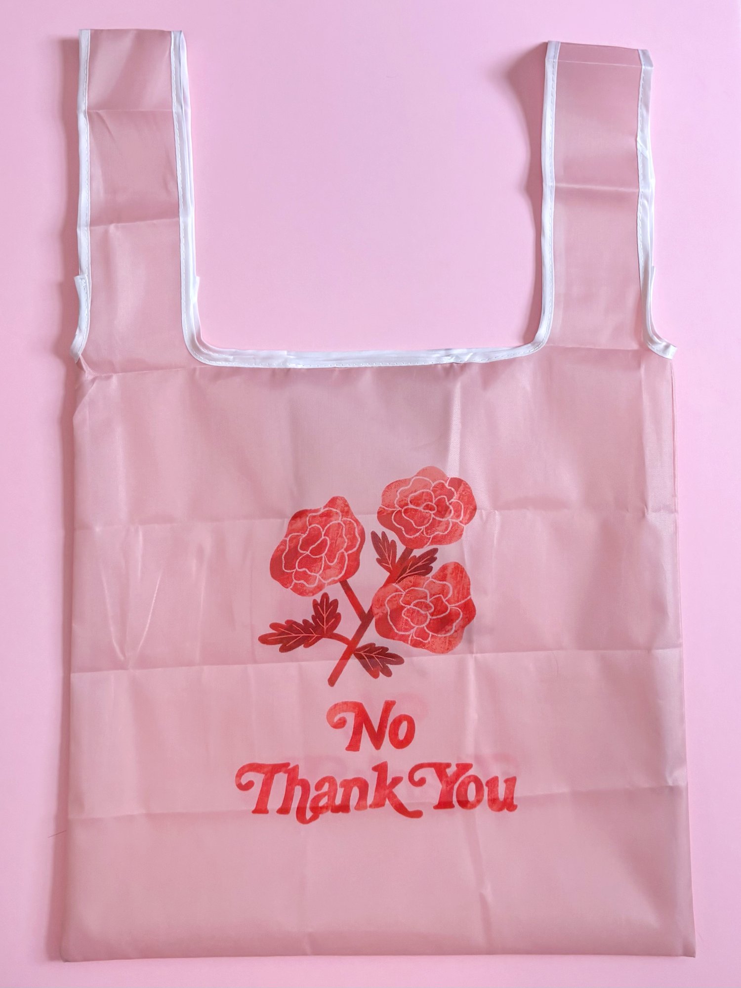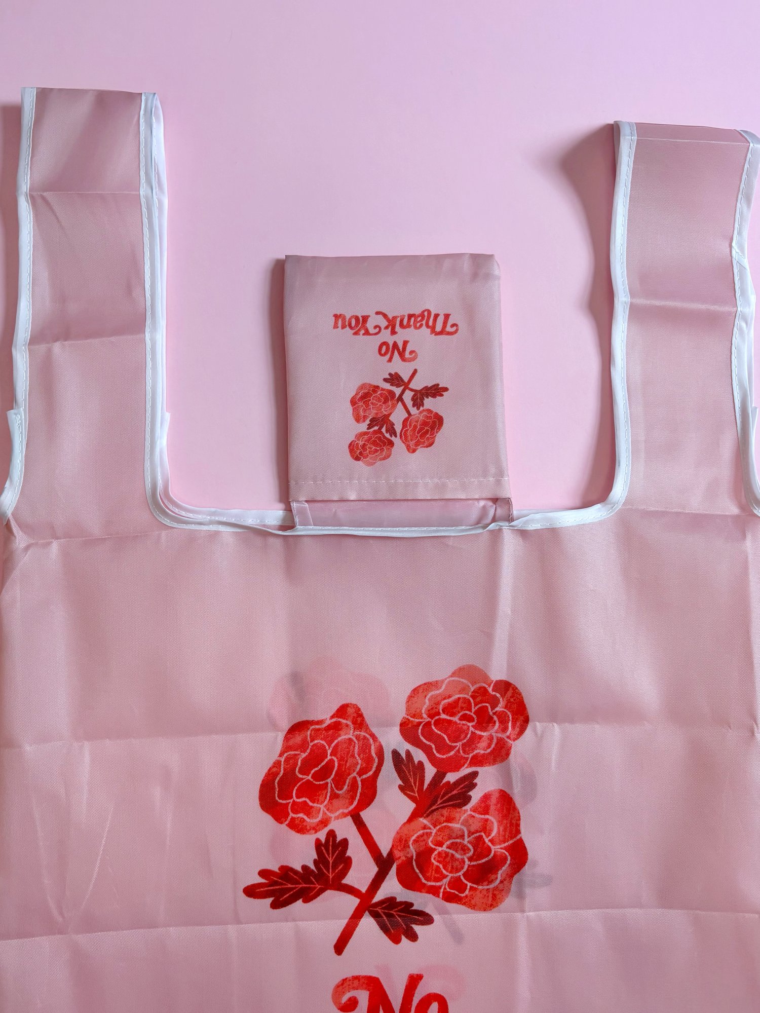 An adorable reusable tote bag with an attached pouch that allows you to fold it up and store it in your purse, car glove box, or even your back pocket!